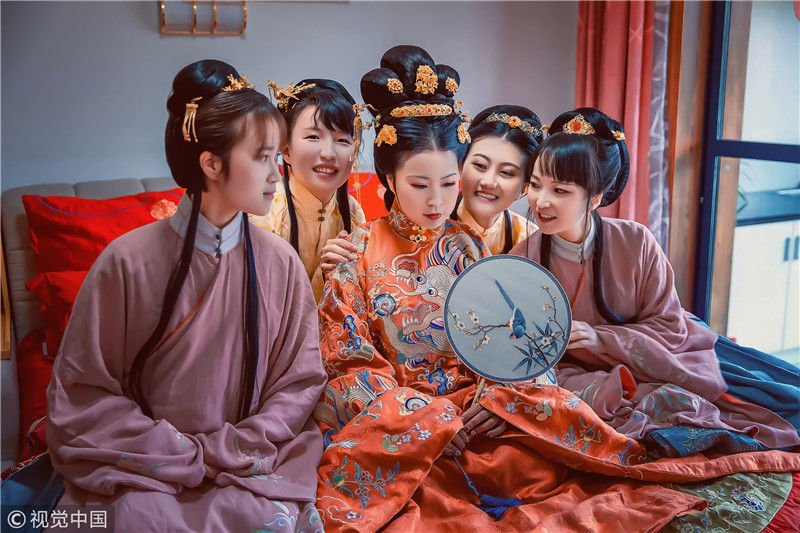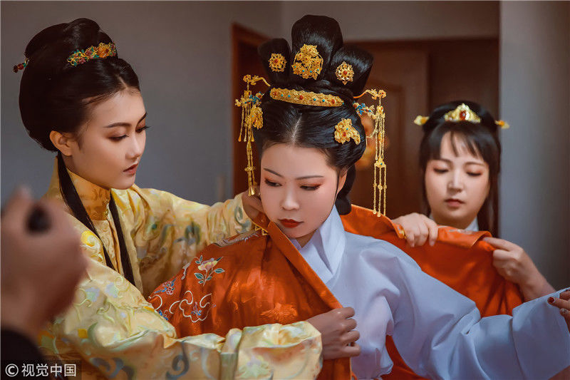 2018年11月18日,浙江嘉興。女孩黃聰今年30歲,是浙江省海寧市硤石人,是一位對(duì)漢文化情有獨(dú)鐘的個(gè)性女孩。對(duì)于這一次的漢婚大禮的每一個(gè)細(xì)節(jié),都非常仔細(xì)。小到發(fā)簪首飾,大到日常禮儀。說起為什么會(huì)舉辦這樣一場(chǎng)古風(fēng)婚禮,她說自己從2013年戀上漢服,就下了這個(gè)決定。