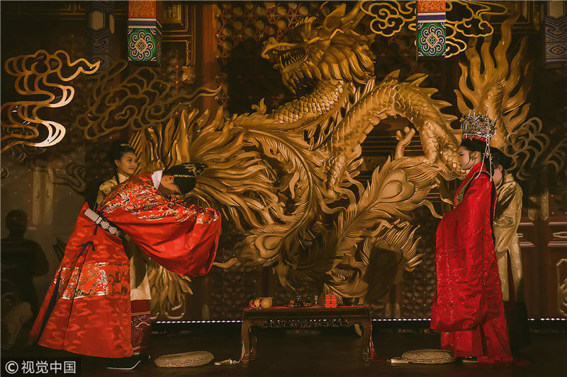 2018年11月18日,浙江嘉興?;槎Y開始,隨著一聲“新婿、新婦正婚大典開禮!掌燈!”兩名侍女提宮燈在前面開道,兩名執(zhí)事手捧大雁跟隨,然后是新人緊隨。新人身后是兩侍女手持沃盥用具,兩執(zhí)事持裝肉的食盤、酒壺,走在最后面。