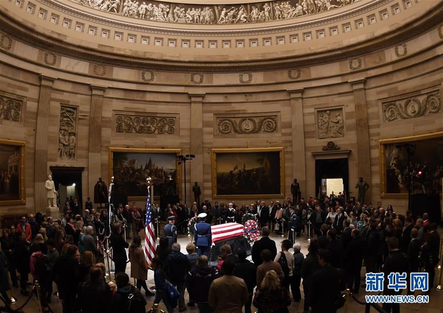 美國前總統(tǒng)老布什的遺體3日下午運(yùn)抵首都華盛頓,安放在國會(huì)大廈圓頂大廳,接受吊唁。