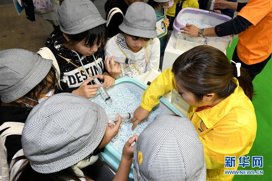 12月6日,在日本東京,小學(xué)生們參觀一種環(huán)保寵物用品。這種利用產(chǎn)業(yè)廢料制成的顆粒狀材料可以吸收寵物尿液并凝聚成團,方便清理。