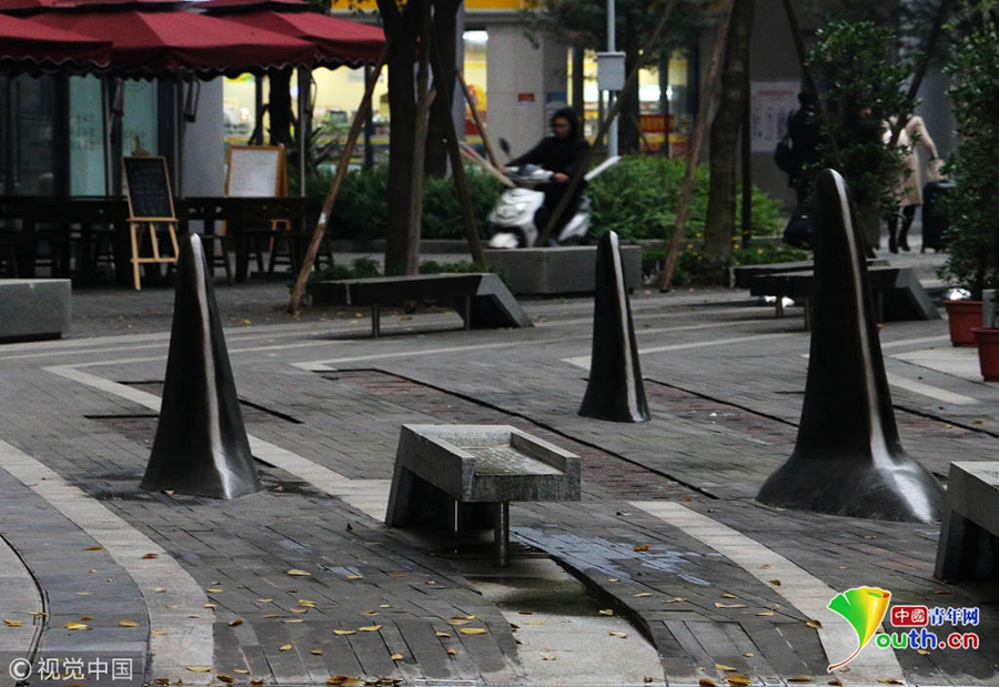 2018年11月20日,重慶一園區(qū)內(nèi)馬路中間突出一排“鯊魚鰭”,司機(jī)路人都被“嚇懵”了。突出的鯊魚鰭將兩側(cè)的車行道分開,原來,這是為了進(jìn)一步保證車流的有序進(jìn)出和行人過街安全,同時(shí)也為了防止亂停車占用人行道,設(shè)置了這種異形“隔離樁”。圖片來源:視覺中國