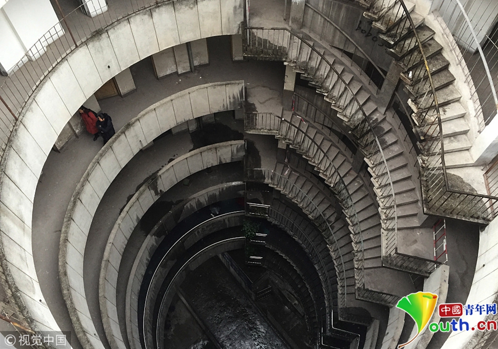 2017年9月27日,重慶,南岸區(qū)某小區(qū)的“螺旋”停車場,從公路到車庫要下5層樓,司機(jī)需要轉(zhuǎn)無數(shù)個(gè)360度圈。圖片來源:視覺中國