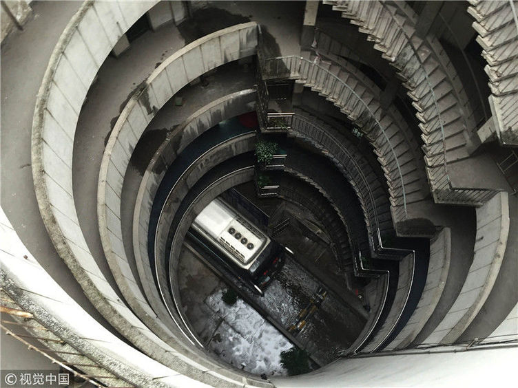 魔幻重慶再添新景觀 公交車穿8層空心圓筒樓