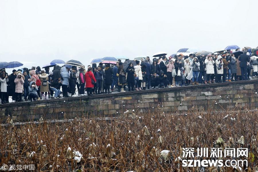 深圳新聞網(wǎng)訊  2018年12月8日,杭州,當日市區(qū)普降大雪,市民和游客扎堆涌入西湖景區(qū),拍攝最美雪景照片以及為自己留影。每次杭州一下雪,斷橋便成為眾多游客欣賞雪景、拍攝雪景的地方,大家都想看看“斷橋殘雪”。游客們扎堆涌入斷橋后,人山人海,讓現(xiàn)場堪比春運場景。因為人太多,雪積不起來,斷橋看不到殘雪。
