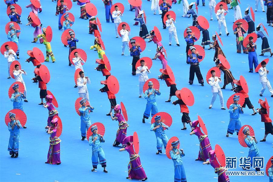 12月10日,廣西壯族自治區(qū)成立60周年慶祝大會(huì)在廣西體育中心隆重舉行。這是慶祝大會(huì)上的群眾文藝表演。 新華社記者 李鑫 攝
