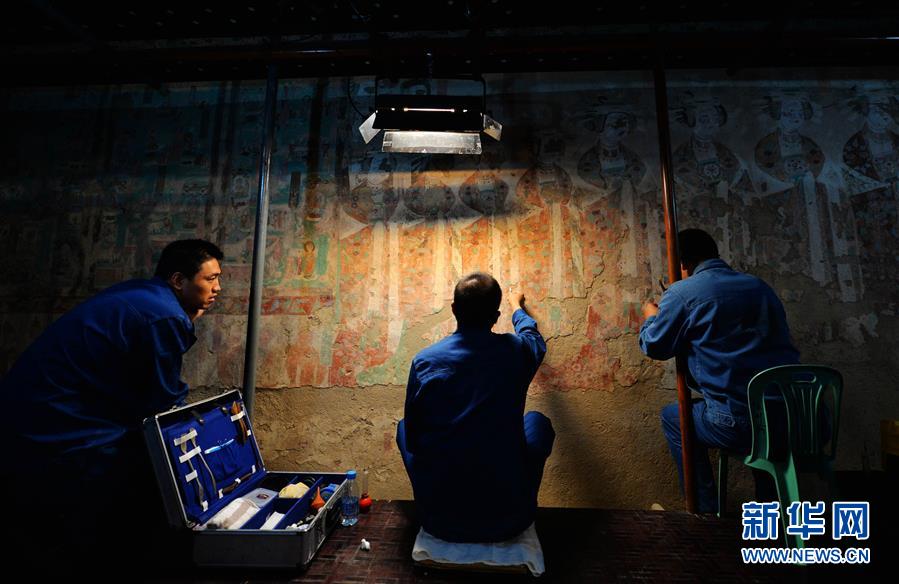 技術人員在莫高窟內(nèi)對病害壁畫進行修復(2014年9月3日攝)。 敦煌記錄歷史。開放的胸襟,曾讓這里成為古代絲綢之路上“華戎所交一都會”。 時隔千年,改革開放的春風吹入西北內(nèi)陸小城,敦煌再度成為中國對外開放的文化前沿。 新華社記者 陳斌 攝