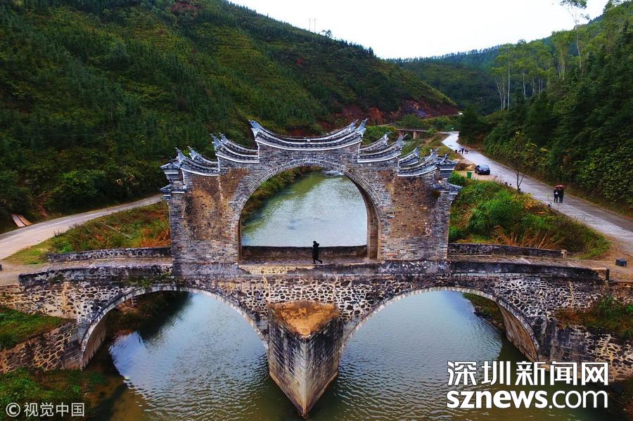 深圳新聞網(wǎng)2018年12月12日訊  太平橋位于江西省龍南縣楊村鎮(zhèn)街道北面太平江上,為兩孔三墩、四拱雙層重疊組合石拱橋。全長50米,造型奇特,上有四通涼亭,以方便行人覽勝和憩息。始建于明正德年間,為全國重點(diǎn)保護(hù)文物保護(hù)單位。 劉占昆 (江西分社)/中新社/視覺中國