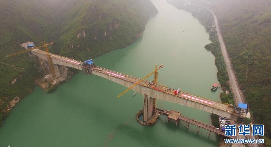 畢都高速公路北盤江大橋是杭瑞高速公路畢都段的控制性工程,位于貴州省和云南省交界處,由貴州省和云南省共建。該橋橋面至江面高差達(dá)565米,成為目前世界第一高橋。主橋?yàn)殇撹炝盒崩瓨?,主?20米,目前位居同類型橋梁2016年12月29日正式通車。