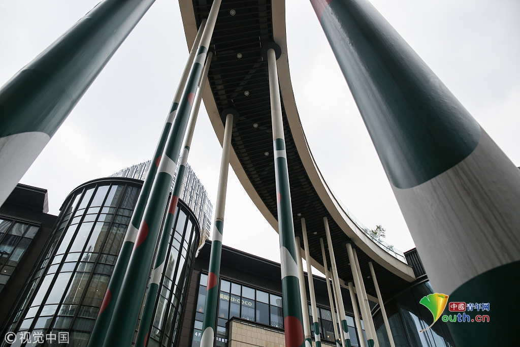 中國青年網(wǎng)2018年12月13日訊 2018年12月11日,重慶,重慶一座造型奇特的人行天橋吸引著人們的注意,柱子高約10米,沒有橋墩,呈半弧形,連接著兩棟獨立建筑,下方靠19根纖細(xì)的立柱支撐著。