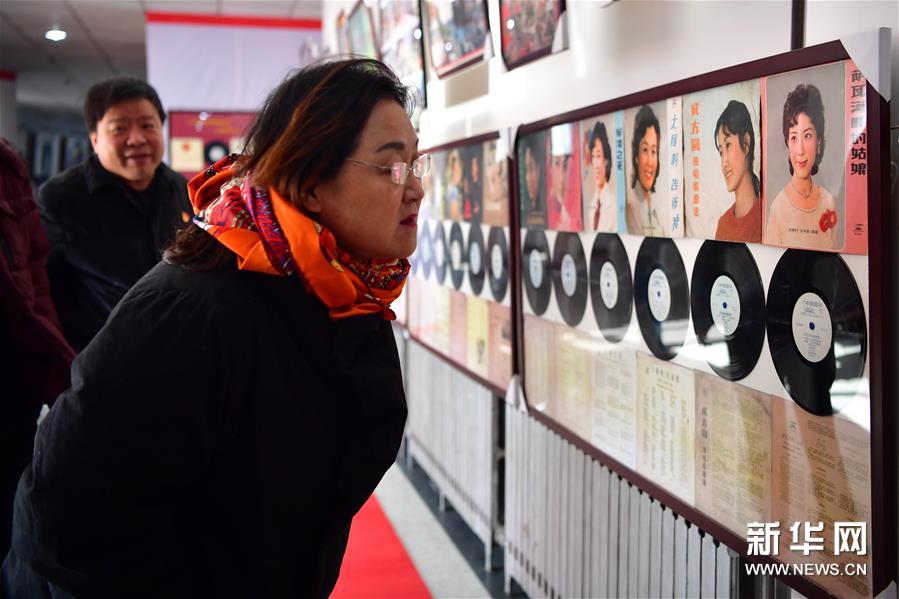 12月12日,觀眾在洛陽隋唐百戲城觀看展出的電影海報與老唱片。新華社記者馮大鵬攝