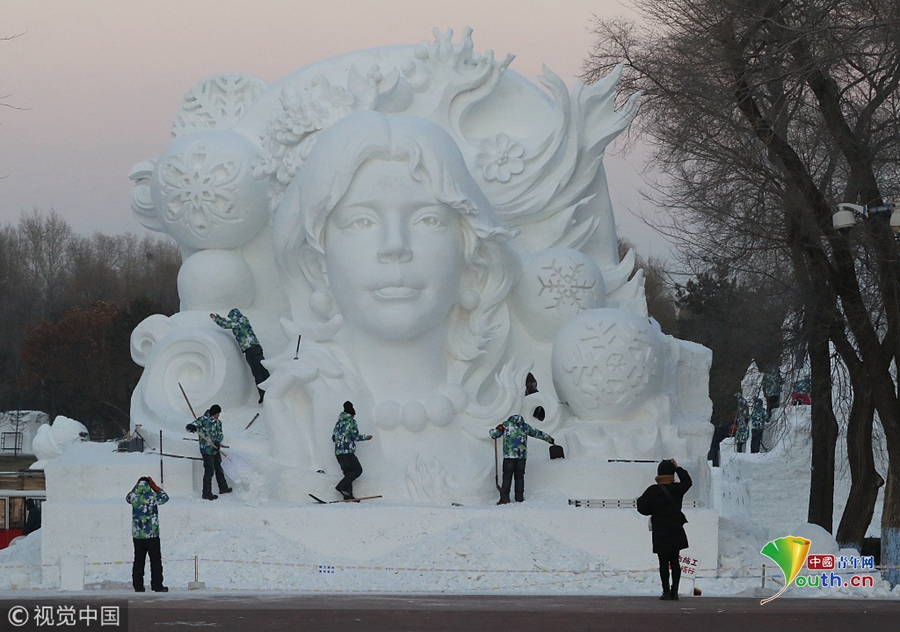 探秘哈爾濱太陽島雪博會:雪雕師精雕細刻建造忙