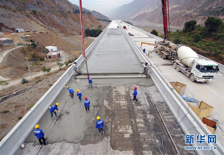 12月15日,中鐵上海局集團公司的施工人員在東格高速公路土建項目中進行橋面鋪裝作業(yè)。新華社記者楊宗友攝
