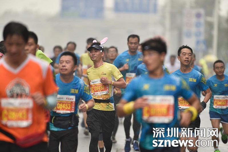 2018年12月16日,深圳國際馬拉松位于后海的折返點,一名選手正在向終點沖刺。