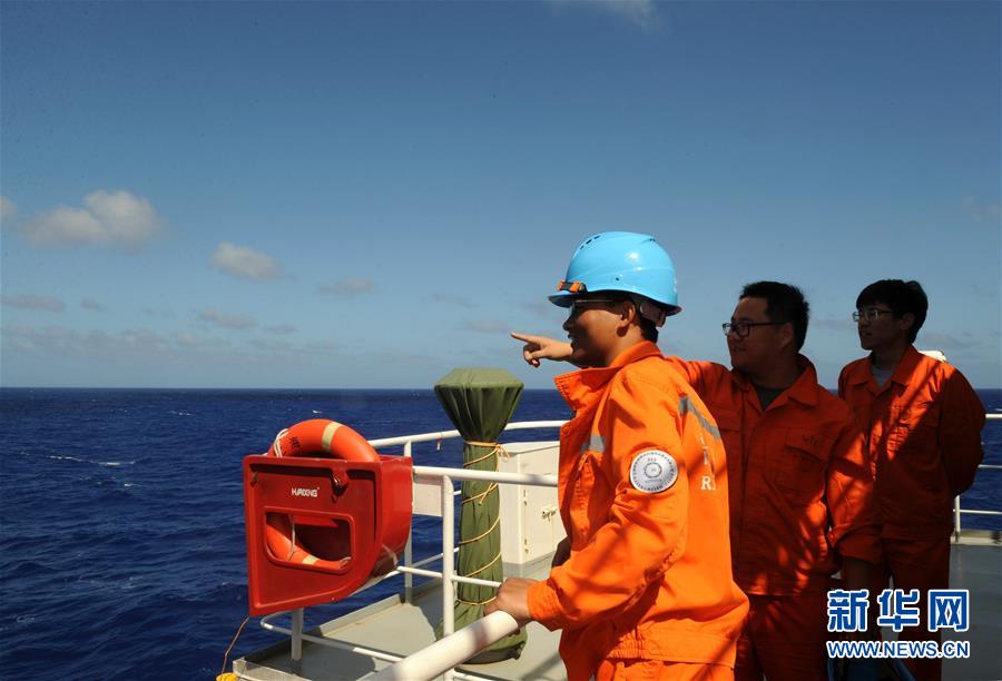 “彩虹魚(yú)”科考團(tuán)隊(duì)隊(duì)員搜尋浮出海面的著陸器(12月15日攝)。