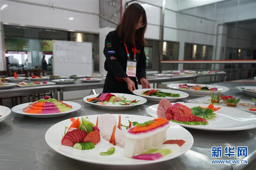 12月15日,工作人員在擺放選手們制作完成的菜品。