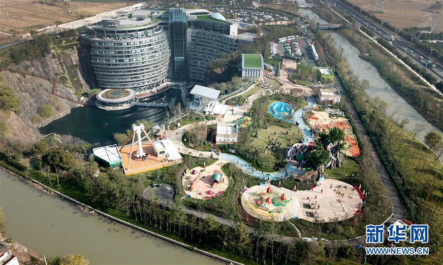 12月18日無人機拍攝的世茂精靈之城主題樂園。 當(dāng)日,“世茂精靈之城主題樂園奇幻親子嘉年華開幕暨上海公益基地揭牌儀式”在位于上海佘山國家旅游度假區(qū)的世茂精靈之城主題樂園一期(“深坑秘境”)正式啟動?!吧羁用鼐场迸徤虾Y苌绞烂揠H酒店,除了擁有俯瞰“深坑”的玻璃棧道外,還包括360度崖壁大擺錘、精靈樹屋、沙漠考古、夢幻水域和蟲蟲世界等項目,帶來親子游玩新體驗。 新華社記者 方喆 攝