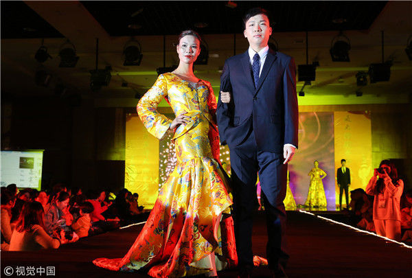 2018年12月17日晚,江蘇南通大學紡織服裝學院慶祝改革開放40周年首屆非專業(yè)新生服飾秀精彩上演,41位模特身著極具年代感的服裝,展示了55套穿搭造型,演繹了40年來不同年代的衣著風采。許叢軍/視覺中國