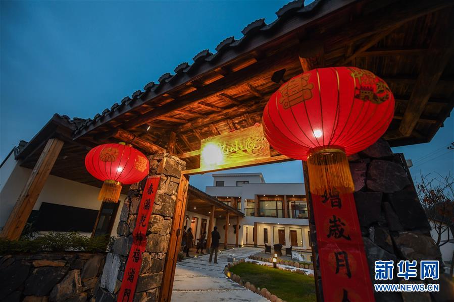 12月19日,客人走進民宿“僻地寒樓”。該民宿共有7幢風格各異的小屋分布在山坡上,頗具特色。河橋鎮(zhèn)青年張雁辭去了上海的工作,回到家鄉(xiāng)開辦了這家民宿。 新華社記者 徐昱 攝