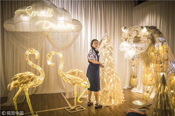 2018年5月6日,廣州,在天河區(qū)一家大商場辦個(gè)展時(shí),用紙片做成的北極熊、大松樹、火烈鳥、紙房子在光線的配合下美輪美奐,吸引了很多顧客駐足?!皫缀趺總€(gè)人一看到,都會(huì)走進(jìn)那個(gè)夢幻的場景里,和這些紙雕一起合影。”圖片攝于2018年5月6日。南塘/視覺中國