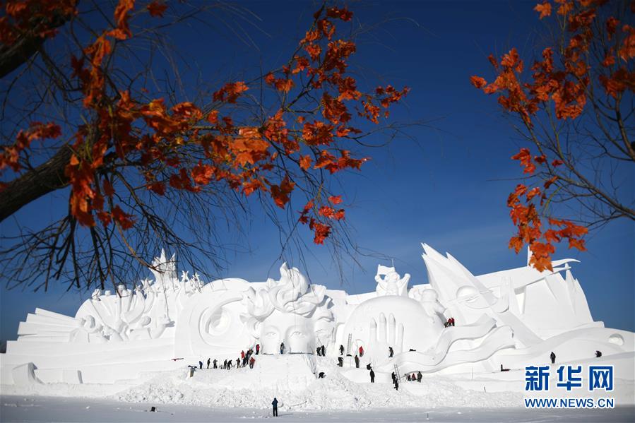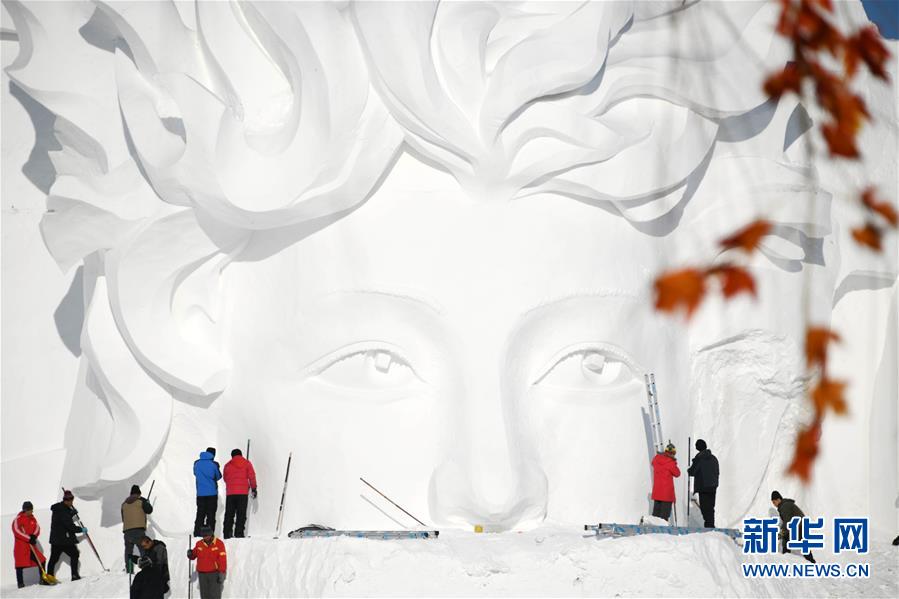 2018年12月13日,黑龍江省哈爾濱市,國內最大的雪雕盛會太陽島雪博會正在緊鑼密鼓建設中,部分雪雕雛形已現(xiàn),雪雕師正在精雕細刻打磨中。