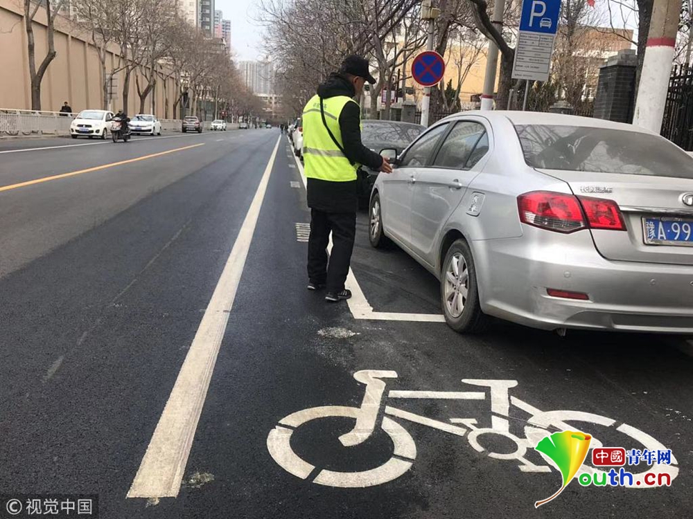 現(xiàn)場,文化宮路與友愛路口附近,新鋪好的路面被劃上了嶄新的行車線和停車位標線。從文化宮路和友愛路交叉口向北,道路東側(cè)的非機動車道被停車位占去后,僅剩下0.8米左右的寬度。同樣在路口南側(cè),道路西側(cè)的非機動車道也被新劃的停車位占去,僅剩不足1米的寬度。