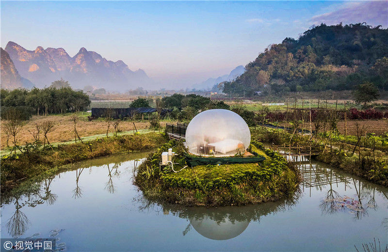 最近這幾年,中國的民宿風(fēng)越刮越猛,各地精品民宿紛紛如雨后春筍一樣冒出了,而且他們用其更獨(dú)特的設(shè)計(jì)感吸引著人們的目光。其實(shí)對(duì)比星級(jí)酒店,民宿最大的優(yōu)勢(shì),就是設(shè)計(jì)風(fēng)格更獨(dú)特,更具藝術(shù)感,也更符合人們的審美要求,同時(shí)又能做到比星級(jí)酒店更舒適,更適合度假,所以大家現(xiàn)在出行都更熱衷于選擇民宿。圖為2018年12月18日,廣西桂林,陽朔縣遇龍河畔。晨光中的泡泡屋。棋簿紫/視覺中國