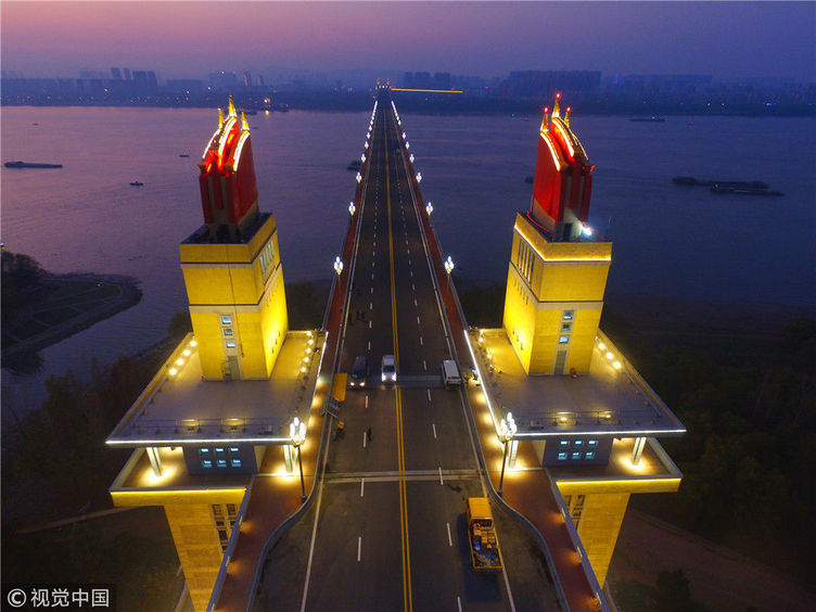 2018年12月13日,江蘇南京,“一橋飛架南北,天塹變通途?!弊鳛槲覈?guó)第一座自行設(shè)計(jì)和建造的雙層鐵路、公路兩用橋,南京長(zhǎng)江大橋在我國(guó)橋梁史上的重要地位不言而喻。從1968年建成后的48年間,它就如同一條巨龍,始終在長(zhǎng)江上默默守護(hù)著人來車往。南京長(zhǎng)江大橋上層是公路橋,下層為雙軌復(fù)線鐵路橋,連接津浦鐵路與滬寧鐵路干線,是我國(guó)南北交通要津和命脈。近年來,由于南京長(zhǎng)江大橋公路橋的實(shí)際通行荷載遠(yuǎn)超原先設(shè)計(jì)標(biāo)準(zhǔn),不僅橋面上擁堵?,F(xiàn),橋梁本身的種種“病害”也日益加深。圖為2018年12月13日,夜幕降臨,南京長(zhǎng)江大橋歸位后的玉蘭花燈重新點(diǎn)亮。大橋玉蘭花燈柱共有299根,每根燈柱上有5盞玉蘭花燈,1大4小,一共1495盞。方東旭/視覺中國(guó)