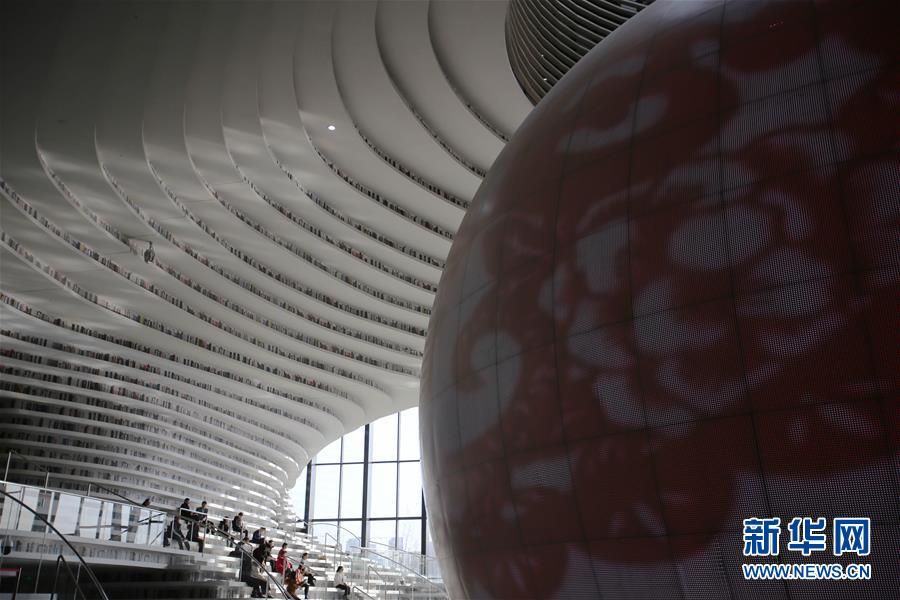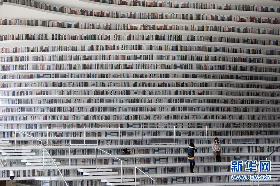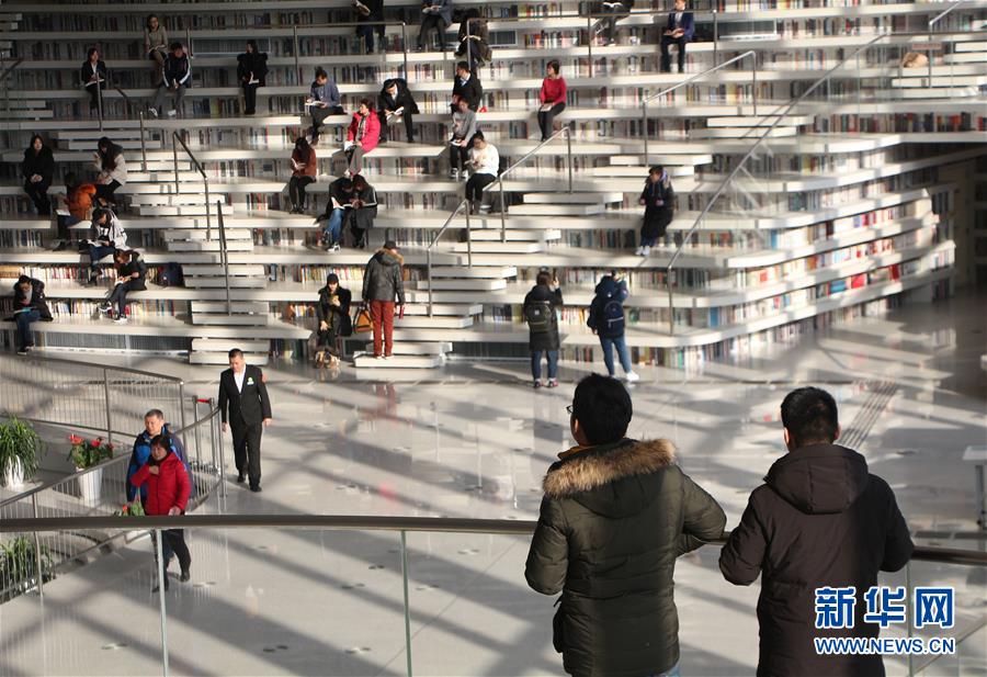 12月27日,讀者在天津濱海新區(qū)圖書館的“書山”上參觀。 濱海新區(qū)圖書館位于天津濱海文化中心,2017年10月1日正式開館,設(shè)計立意為“濱海之眼”和“書山有路勤為徑”。圖書館現(xiàn)有藏書60多萬冊,一年多來接待讀者約280萬人次,已成為濱海新區(qū)的文化“新地標”。 新華社記者段卓力攝
