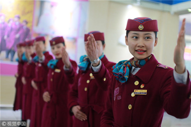 2018年12月27日,四川成都,為備戰(zhàn)即將開通的成雅鐵路,中國鐵路成都局集團(tuán)有限公司成都客運(yùn)段動(dòng)車二隊(duì)對成雅動(dòng)車的乘務(wù)人員進(jìn)行理論、形體、服務(wù)禮儀等內(nèi)容的培訓(xùn)。