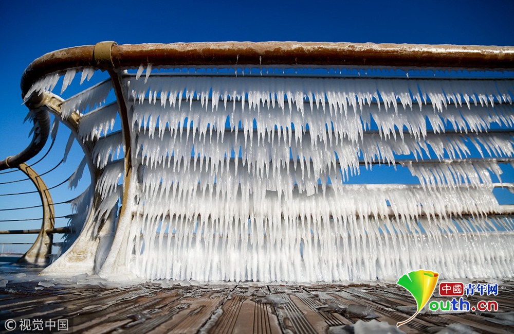 渤海海水在北風(fēng)的作用下涌向岸邊,在大連東港海岸護(hù)欄上凝結(jié)成冰凌,形成約有兩公里的冰凌奇觀。圖為大連市東港海岸護(hù)欄結(jié)滿晶瑩剔透的冰棱。圖片來源:視覺中國