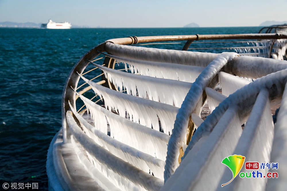 2018年12月29日,大連,晶瑩剔透的冰凌錯(cuò)落有致的懸掛在東港海岸的木棧道護(hù)欄上,美輪美奐,形成了一道“風(fēng)雕冰琢”的風(fēng)景。