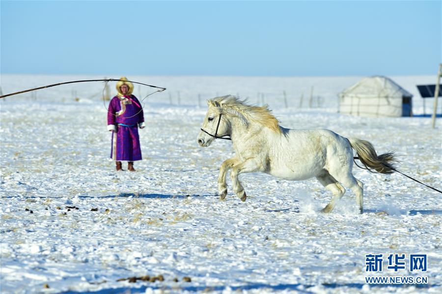 1月8日,牧民進(jìn)行套馬表演。 時(shí)下正值草原冬季旅游旺季,內(nèi)蒙古自治區(qū)西烏珠穆沁旗的牧民們?cè)谘┰弦徽股硎?,為游客展現(xiàn)獨(dú)特的民族風(fēng)情。 新華社記者 鄒予 攝