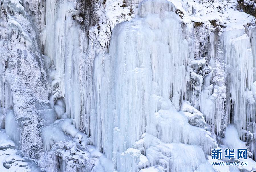 這是在吉林省長白縣十五道溝望天鵝景區(qū)拍攝的懸于石壁間的冰凌(1月3日攝)。新華社記者許暢攝