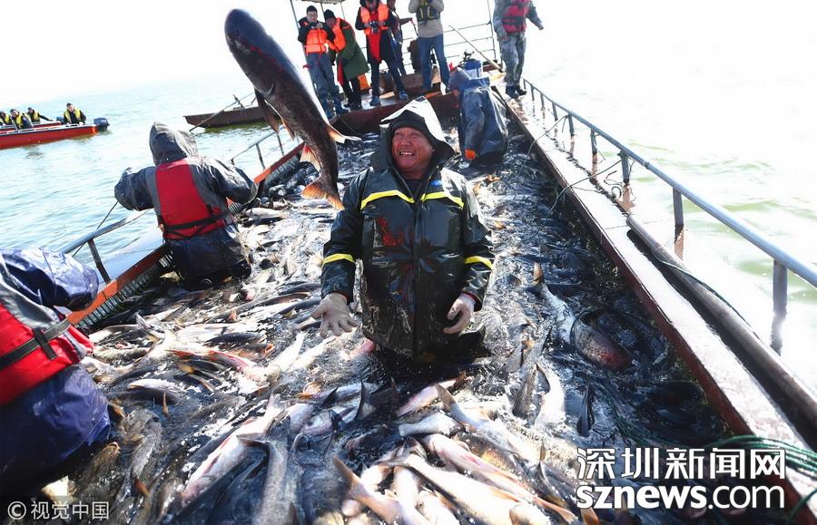 在河南省洛陽(yáng)市嵩縣,第三屆陸渾開漁節(jié)啟幕,捕撈隊(duì)員們?cè)诤牧阆率畮锥鹊臏囟认麻_始捕魚,收獲新年“第一網(wǎng)”——超10噸魚,現(xiàn)場(chǎng)一派魚躍人歡的喜悅景象。