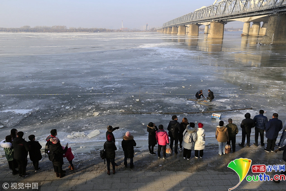 2018年11月25日,黑龍江省哈爾濱市,松花江封江不久,已經(jīng)有人蹬江鑿冰下網(wǎng)捕魚。 圖片來(lái)源:視覺(jué)中國(guó)