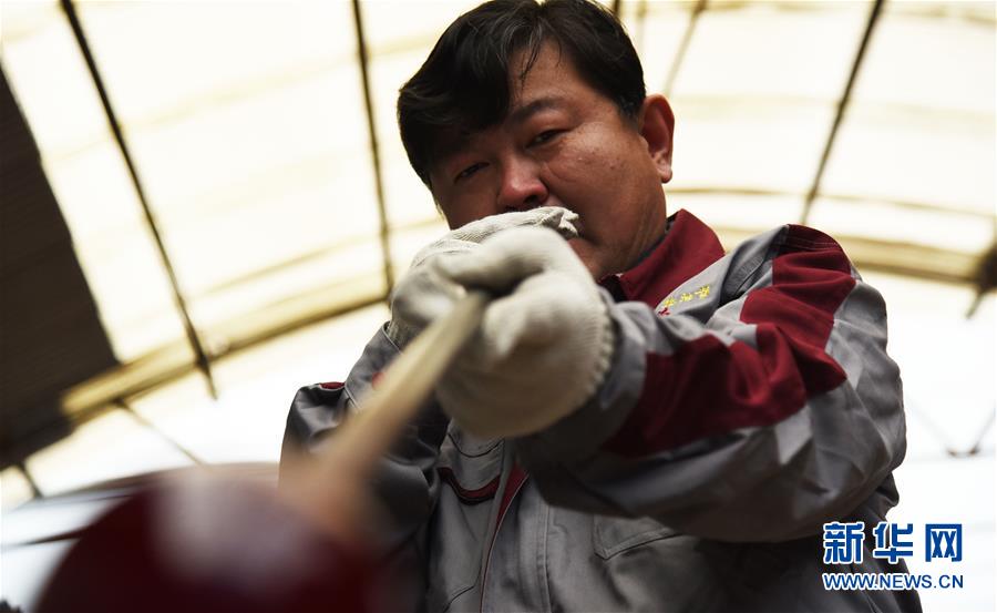 1月12日,孫云毅在吹制雞油黃琉璃藝術品。
