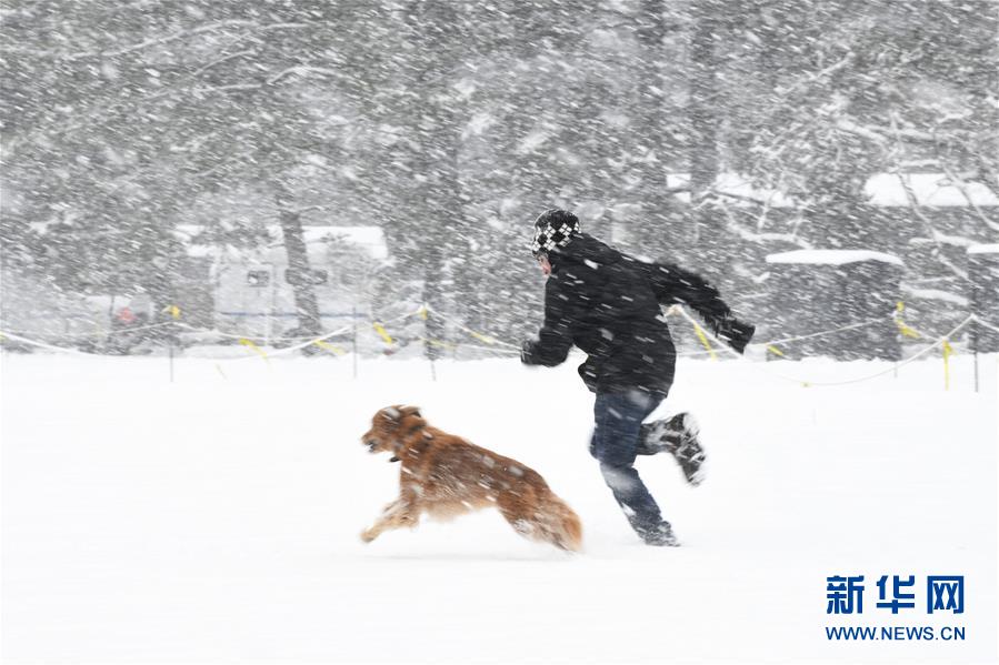 1月13日,在美國首都華盛頓,一名男子與寵物狗在林肯紀(jì)念堂旁玩耍。 近日,美國首都華盛頓及其周邊地區(qū)普降暴雪。降雪導(dǎo)致部分航班晚點(diǎn)或取消,道路交通事故增多。 新華社記者 劉杰 攝