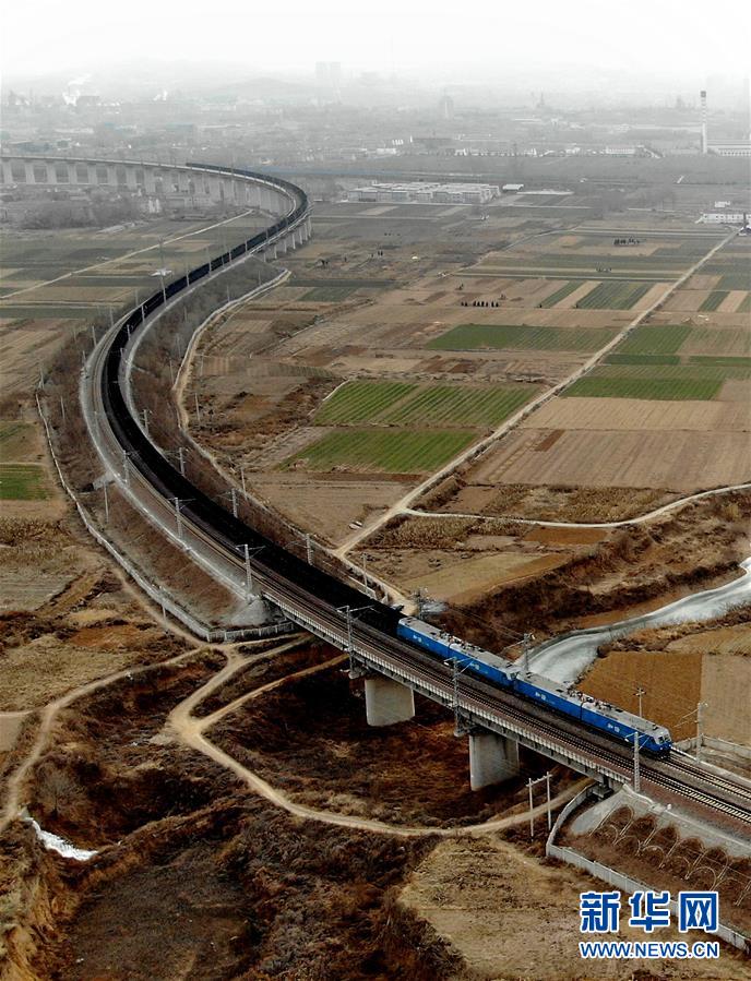 1月15日,一列重載列車行駛在瓦日鐵路紅旗渠至水冶南區(qū)段(無人機(jī)拍攝)。 新華社記者李安攝