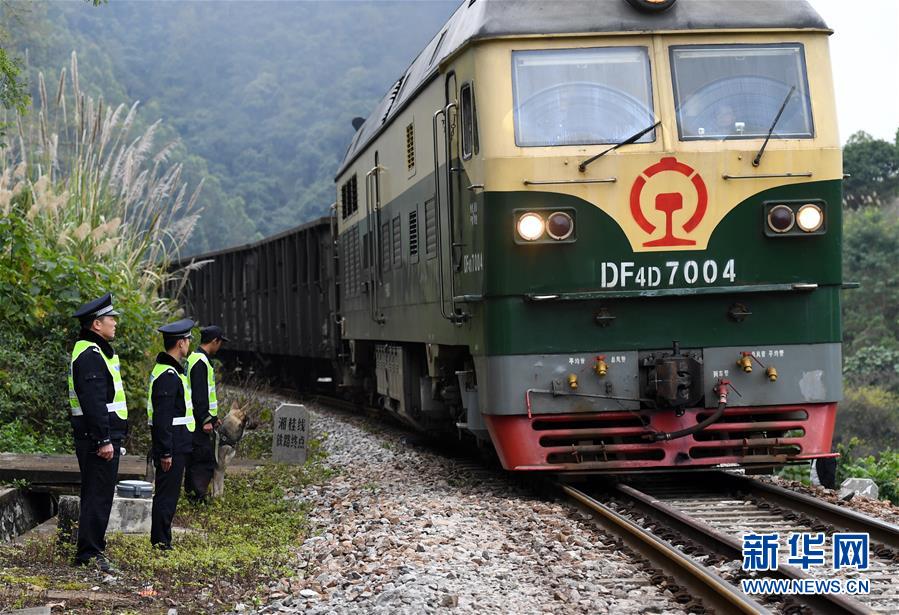鐵路公安民警陸日峰(左一)和同事目送著一列火車通過湘桂線鐵路終點(diǎn)從越南進(jìn)入中國(2018年12月31日攝)。新華社記者陸波岸攝