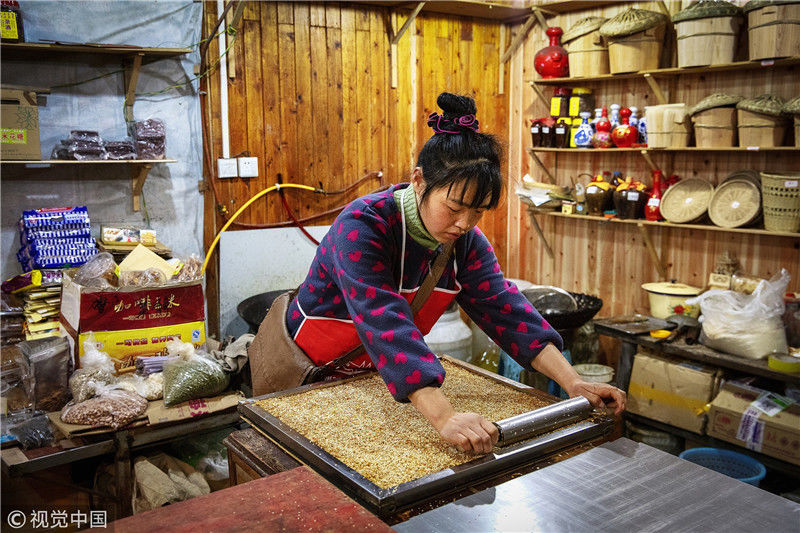 重慶江津區(qū)中山古鎮(zhèn)第十四屆 “千米長宴”民俗文化節(jié)盛大啟幕。上午10時(shí),中山古鎮(zhèn)老街人聲鼎沸,窄窄的青石板路打掃得干干凈凈,家家戶戶門口掛起喜慶的紅燈籠,老商鋪門口擺滿了米酒、烤糍粑、煙熏豆腐……此次“千米長宴”以“絲路情緣,‘埃’上中山”為主題?!扒组L宴”期間,游客們不僅可以一雙筷子吃遍全街,還可欣賞到祈福祭祀、民俗拜年、“打盆上菜”等表演,同時(shí)還增設(shè)了以唱、跳、講故事的上菜方式情景演繹愛情主題的文化餐飲,展示富硒愛情宴的文化內(nèi)涵。圖為街坊們?cè)陬^天就開始準(zhǔn)備各種菜肴與小吃。