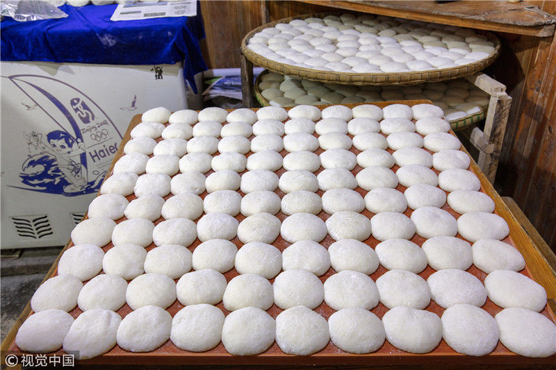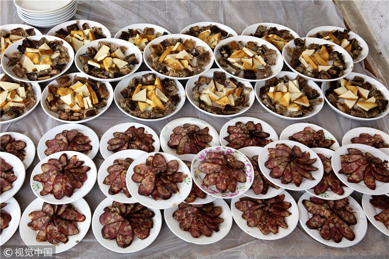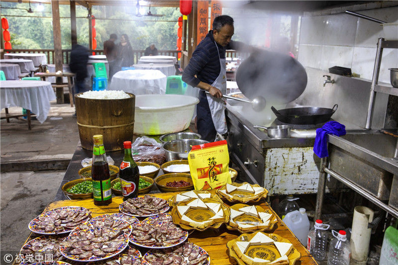 2019年1月26日,重慶中山古鎮(zhèn),880桌“千米長宴”5萬人共品年味。街坊們?cè)陬^天就開始準(zhǔn)備各種菜肴與小吃。