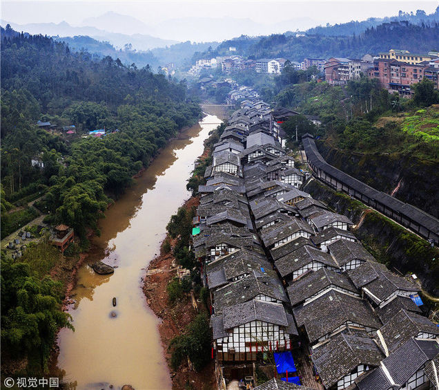 2019年1月26日,重慶中山古鎮(zhèn),880桌“千米長宴”5萬人共品年味。夜幕下的中山古鎮(zhèn),燈光璀璨,流水潺潺。