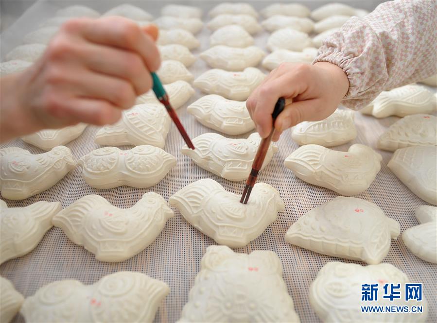 1月31日,河北省黃驊市一家面花作坊的工人給剛剛出籠的面花點(diǎn)上寓意吉祥喜慶的紅點(diǎn)。 河北黃驊市有著過年蒸面花的習(xí)俗。春節(jié)前夕,當(dāng)?shù)孛婊ㄖ谱鞴S加班加點(diǎn)制作面花,供應(yīng)春節(jié)市場(chǎng)。 新華社記者牟宇攝
