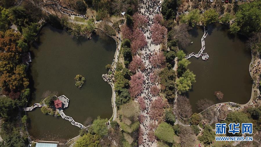 3月31日,游客在中國科學(xué)技術(shù)大學(xué)東區(qū)觀賞櫻花(無人機拍攝)。