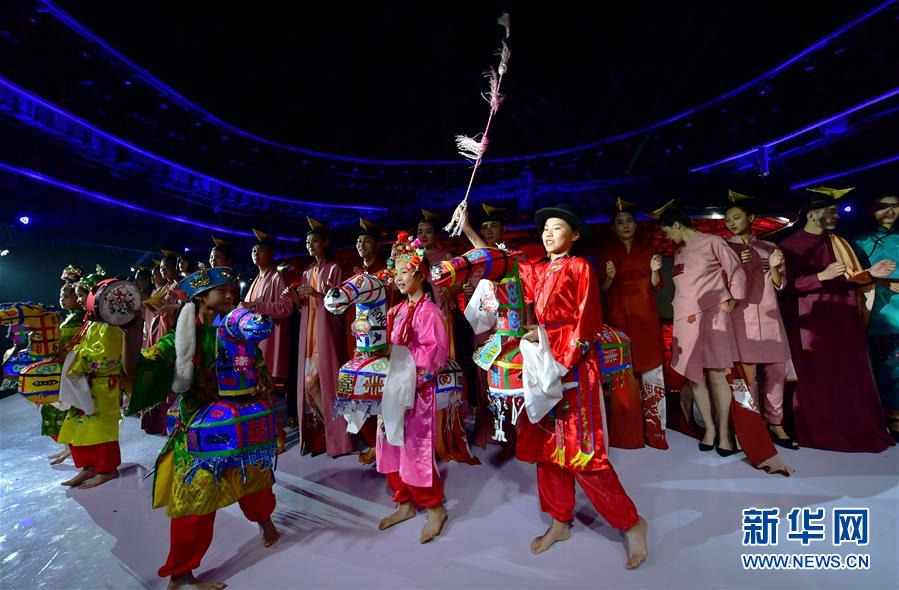 4月27日,小模特身穿民族服飾展示土樓當?shù)氐姆俏镔|文化遺產(chǎn)竹馬戲。 當日,土樓光語國際時尚大秀在福建省南靖縣的土樓裕昌樓內舉行。這場融匯文化、時尚與旅游元素的大秀,通過傳統(tǒng)與時尚的有機融合,展現(xiàn)南靖土樓及文化的魅力和風采。 新華社記者魏培全攝