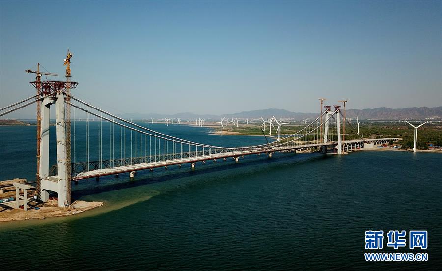 建設中的官廳水庫公路大橋(5月6日無人機拍攝)。 河北省懷來縣官廳水庫公路大橋是懷來沙城至東花園公路的節(jié)點工程,預計該橋將于2019年6月竣工。 新華社記者 楊世堯 攝
