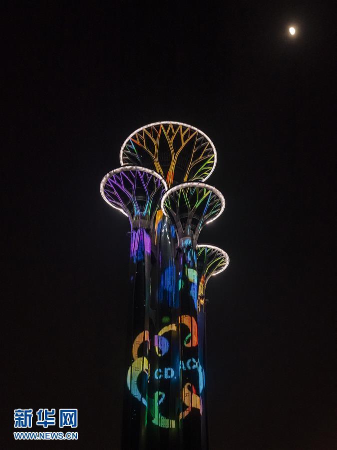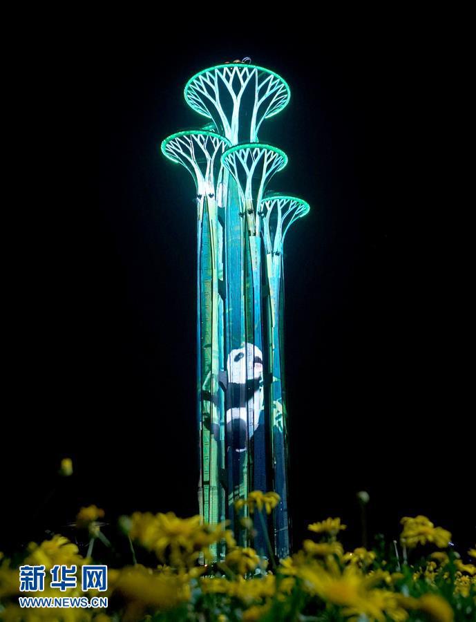 奧林匹克塔燈光璀璨(5月14日攝)。 當晚,一場“空間光影秀”在北京上演。 新華社記者 李賀 攝