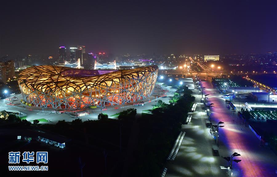 “鳥巢”燈光璀璨(5月14日攝)。 當晚,一場“空間光影秀”在北京上演。 新華社記者 沈伯韓 攝