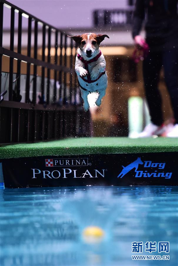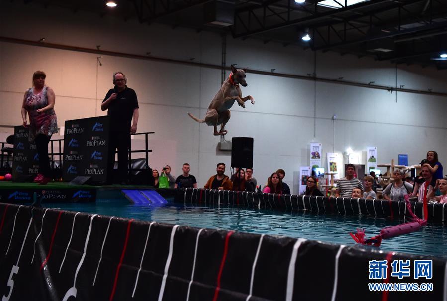 5月19日,在德國(guó)多特蒙德舉行的寵物展上,一只獵犬參加跳水比賽。 為期三天的德國(guó)多特蒙德“狗和貓”寵物展19日落幕。寵物展期間,人們帶著自己的“萌寵”來到會(huì)場(chǎng),參與寵物跳水、舞蹈、選美等趣味比賽,并與其他寵物愛好者及展商交流互動(dòng)。 新華社記者逯陽攝