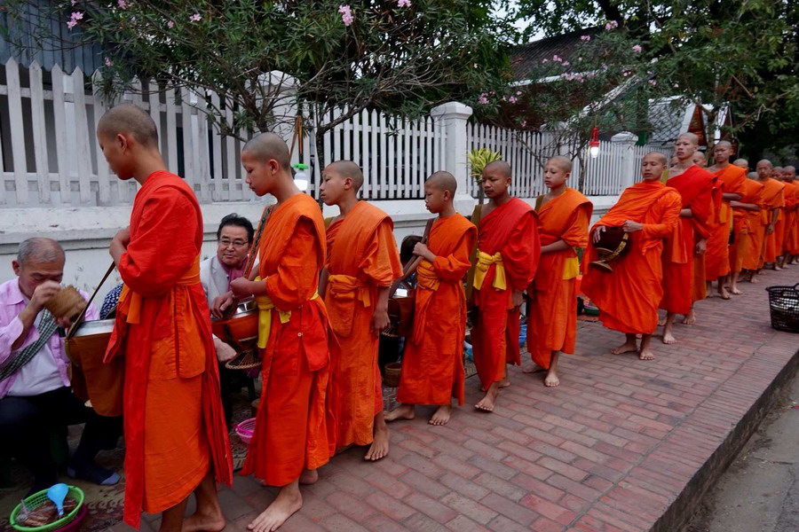 每天清晨,虔誠(chéng)的佛教徒備好花塔和糯米飯,跪坐在街道兩旁,等候僧侶前來(lái)化緣,然后將糯米飯和粽子放到他們的化緣缽中,僧侶則以誦經(jīng)祈福答謝施主。